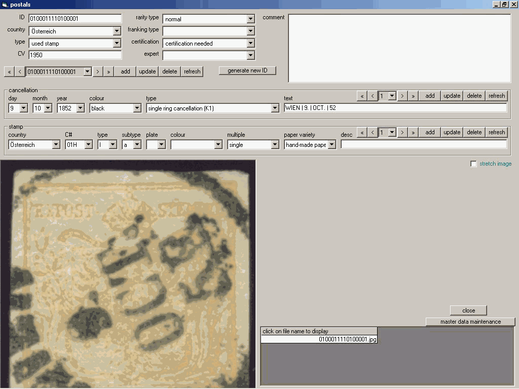 image(s) of the postal.Caution: Images have to be saved in the subdirectory images under the program-directory, the file name(s) have to be prefixed with the ID and suffixed by the file type .jpg to be recognized by the program.